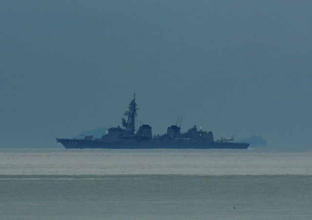 今津川の堤防で撮影した、呉基地所属の護衛艦DD-113「さざなみ」